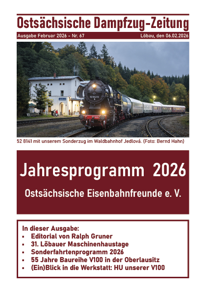 Dampfzugzeitung Nr. 67 steht die aktuelle Dampfzugzeitung bereit. Freuen Sie sich auf das Jahresprogramm für 2026, eine Vorschau auf die 31. Löbauer Maschinenhaustage und einen Bericht über 55 Jahre Baureihe V100 in der Oberlausitz. Passend dazu gibt es einen (Ein)Blick in die Werkstatt zur HU unserer 112 331-4.